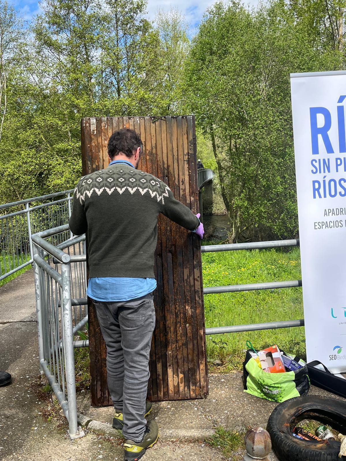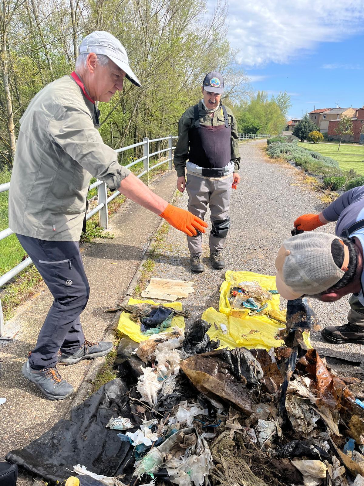 El día arrancó, como corresponde, con una pesca de basura en un tramo de 100 metros de largo y 6 metros de ancho, 50 a cada lado de la pasarela. A primera vista, parecía que en ese tramo no íbamos a rascar bola (ya sabéis, el drama del sorteo…), pero el personal, testarudo como buen pescador, se calzó guantes, sacaderas y gafas polarizadas, y se lanzó al tajo. Y ¡sorpresa!: empezaron a aparecer piezas ocultas entre la maraña de palos, alisos y humeras de la ribera. Algunas acabaron en la cesta, otras, más escurridizas, lograron escapar río abajo. Eso también cuenta, que conste. Habría que buscar una manera de puntuarlas.