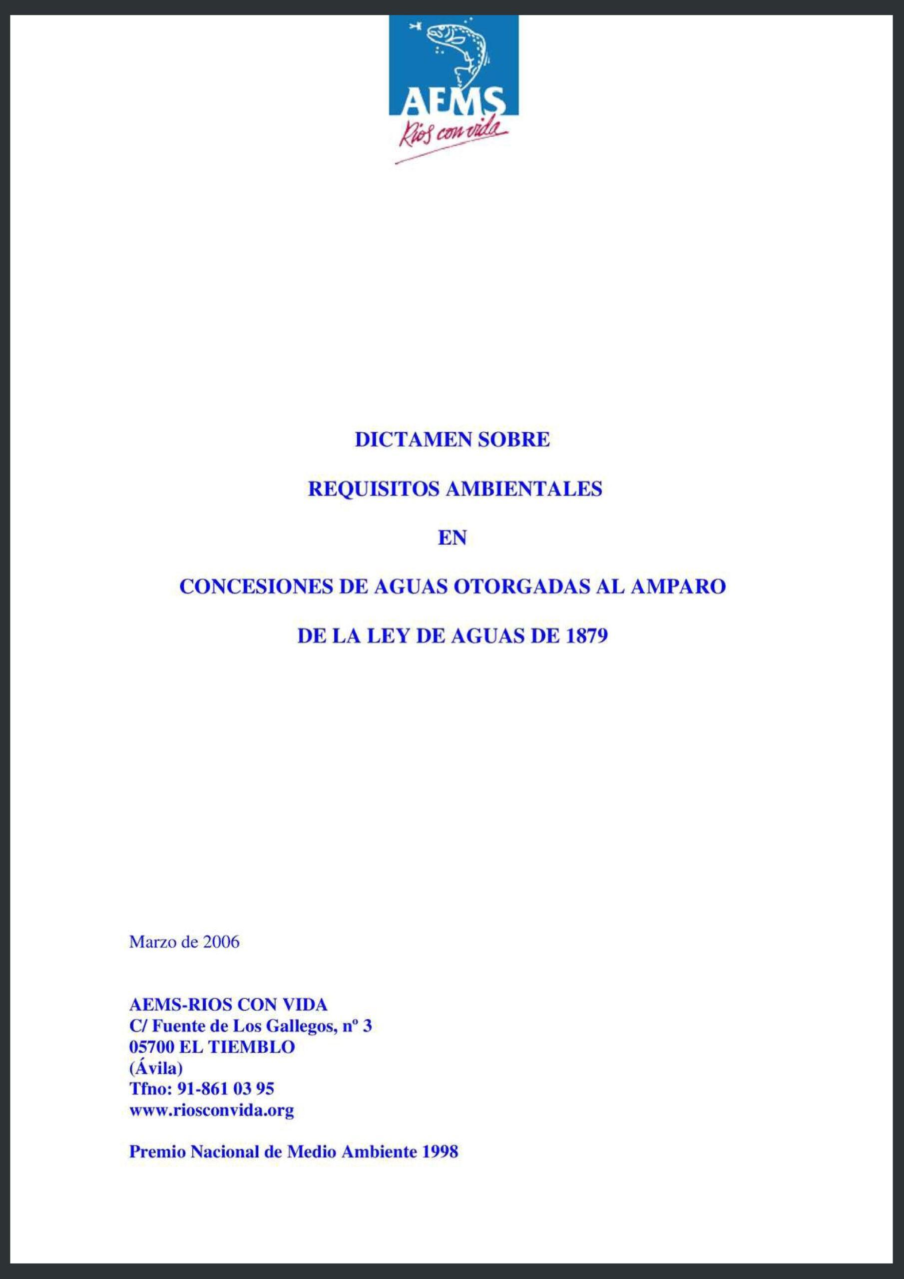 Dictamen sobre requisitos ambientales en concesiones de aguas otorgadas al amparo de la Ley de Aguas de 1879. Marzo de 2006. Accede.